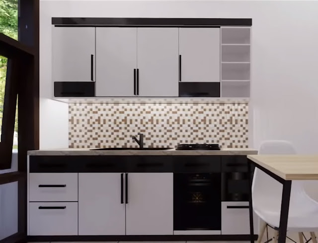 Desain dapur bernuansa minimalis dan mungil dengan tema monokrom yang elegan.