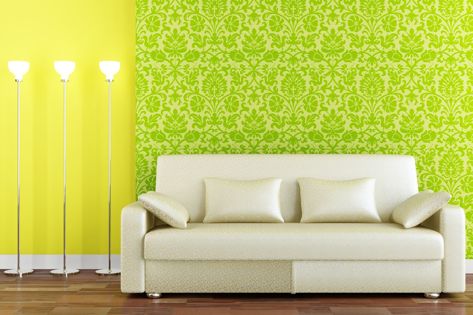 Untuk ruang tamu, lebih baik memilih wallpaper hijau dengan warna yang lebih tenang dengan kombinasi warna biru, putih, krem, oranye atau merah.